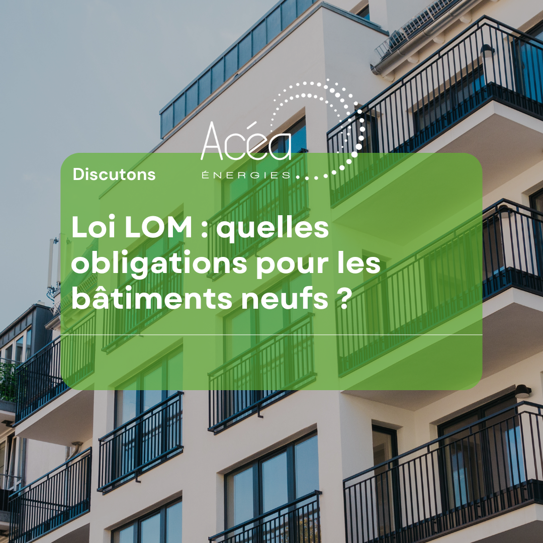 La loi LOM impose aux bâtiments neufs, à compter de janvier 2023, de produire une partie de leur consommation énergétique grâce à des installations photovoltaïques. La quantité d'énergie solaire à produire dépend de la surface utile du bâtiment et de sa zone climatique.